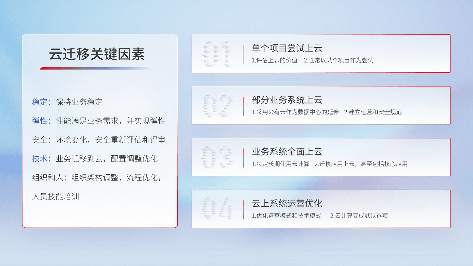 结合实际业务,,,,从规划设计、、、云平台选型、、云原生改造、、数据迁移、、、集成交付,,,迁移全过程为客户识别最佳上云路径,,做好风险识别管理,,,,设计网络架构、、、、身份权限、、安全审计合规、、操作审计、、、日志审计、、监控告警策略、、、多站点容灾设计等,,,,对云上基础设施进行整体规划,,,,提升IT治理水平,,,,以满足弹性、、、高可用、、、高性能的需求。。。。